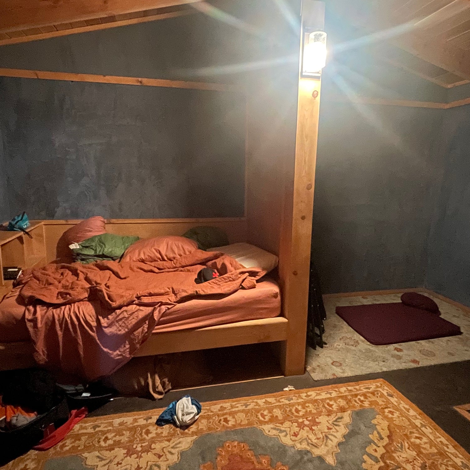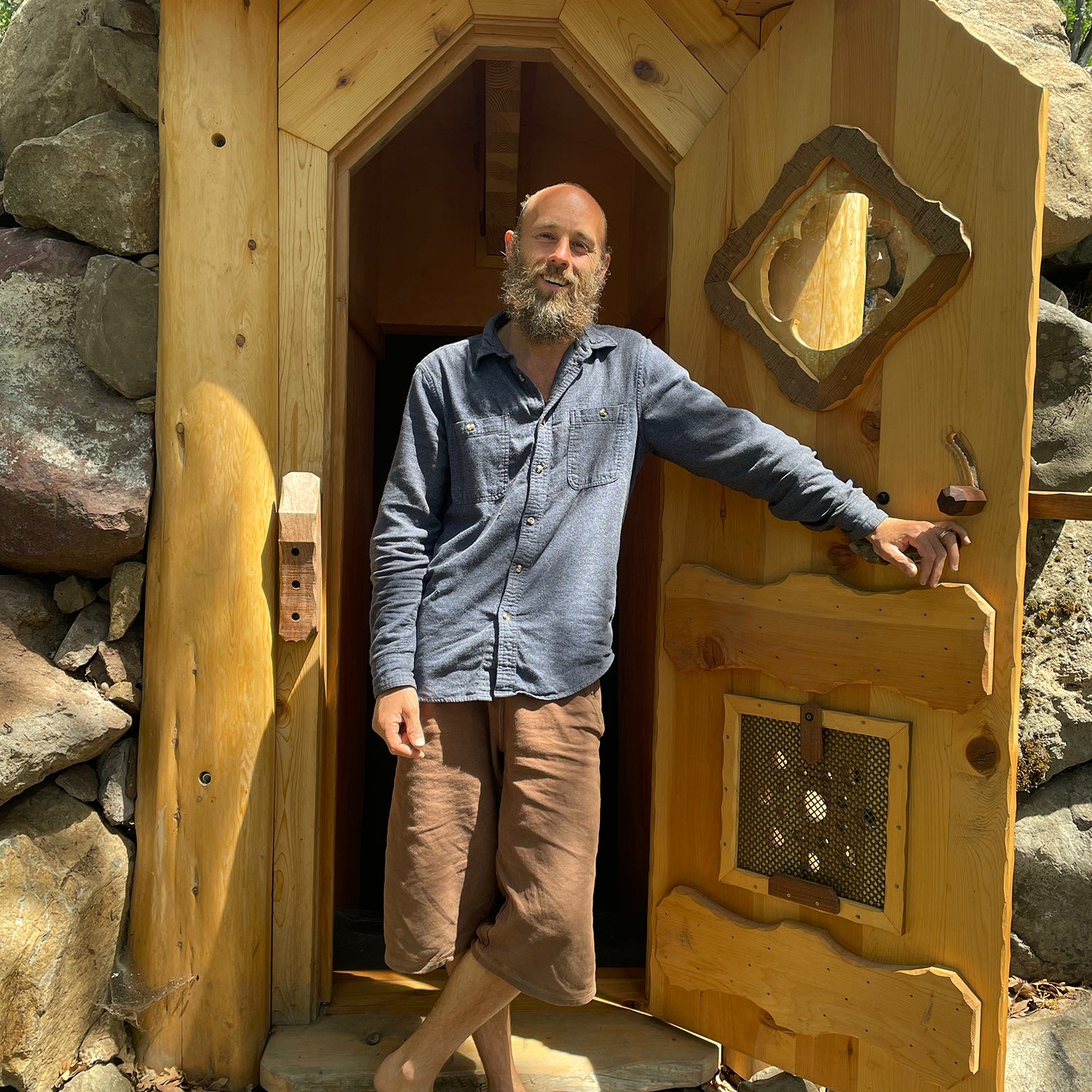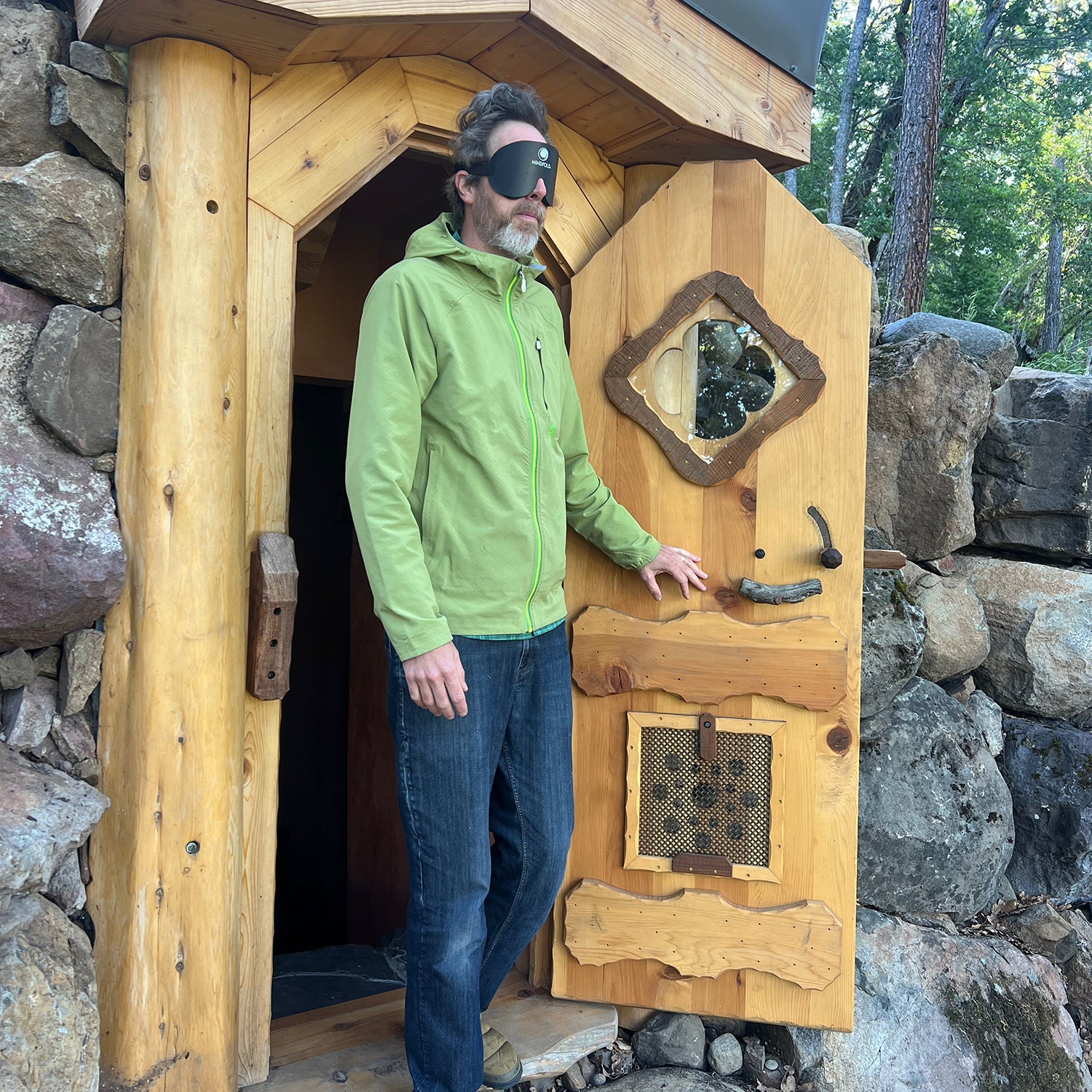 I walk slowly, deliberately, uphill to a small clearing ringed by aspen and oak. The anxiety that’s been ricing my lungs turns steely and sharp when I see a pale wooden door built into a hillside, framed by lava rock. It looks like the entrance to Bilbo Baggins’s house. I go in. A stairway tumbles down to a windowless, 300-square-foot room with textured walls, a bathroom, and a wooden bed that smells like sage. A single low-wattage bulb hums faintly overhead. It’s controlled by a switch covered with a hard plastic guard, which makes it difficult to turn off and on. That’s the point.