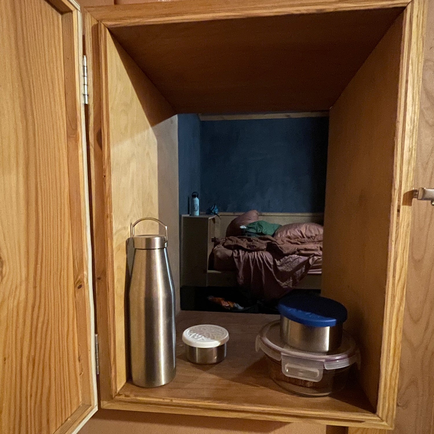Evening comes. Time to be brave. I take one last look around outside and gather a few more nuts. A mountain chickadee twitters about. Deer slip through the grass. I go inside and seal myself into the room with a few necessities I’ll be able to locate by touch. A toothbrush. A Hydro Flask. A gray cotton onesie my wife got me for Christmas, because of the way it feels and smells—two senses the dark can’t steal. I light a small candle and turn off the overhead light, hoping to feel a sense of control for one last minute.