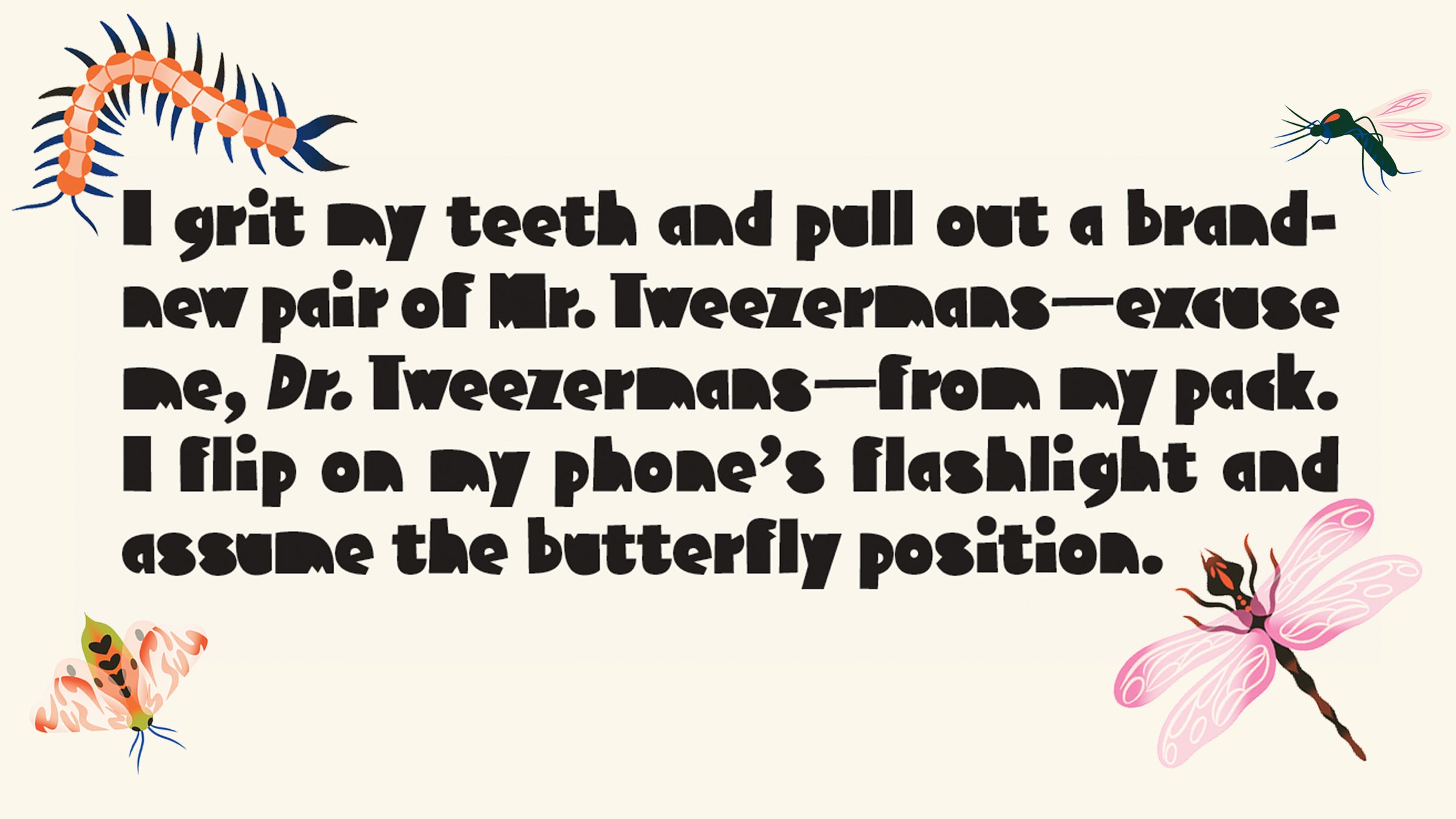 I grit my teeth and pull out a brand-new pair of Mr. Tweezermans—excuse me, Dr. Tweezermans—from my pack. I flip on my phone’s flashlight and assume the butterfly position.