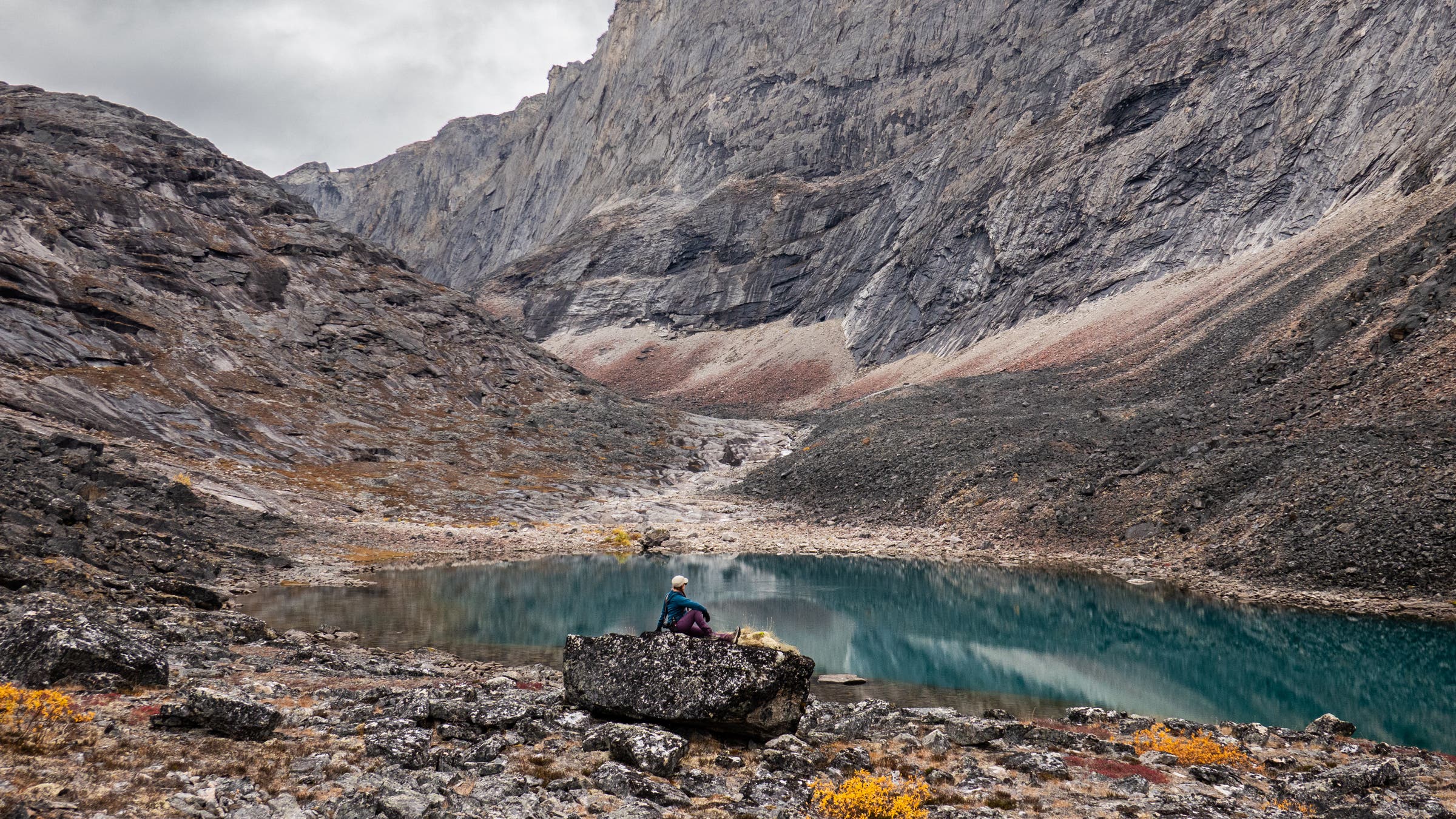 When we crested the enormous gully of rocks, we were met with a body of crystal-clear cerulean water, lined with crumbling charcoal cliffs. Pops of marigold and rust-colored tundra plants clung to the pebbled shore. The silence was tremendous. It was as though our party had been teleported onto some far-off planet and we were the only sentient creatures.