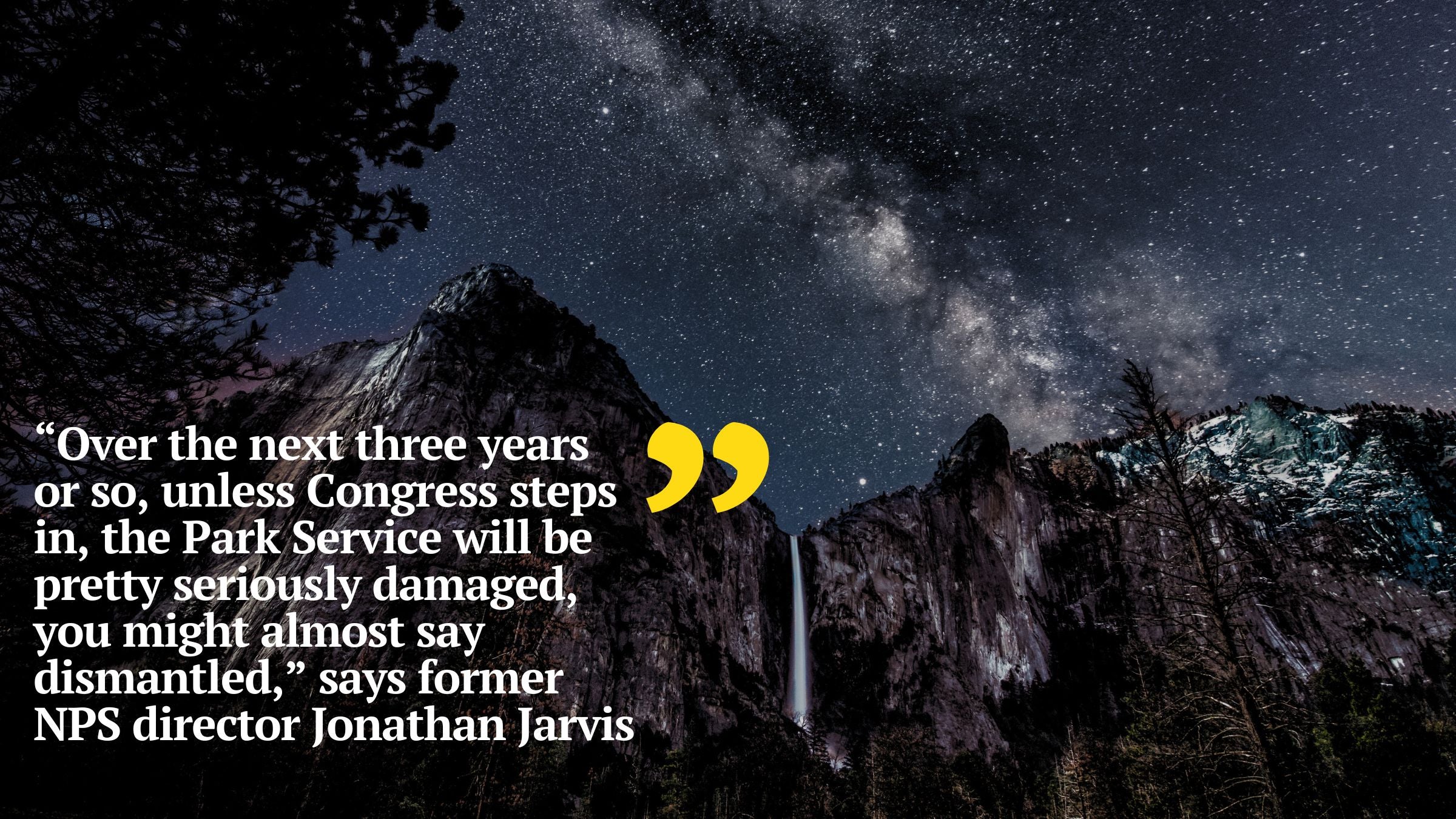 But, parks advocates say, these aren’t the vital signs that indicate the health of a national park. Experts who understand how parks actually work say they’re in trouble. “Over the next three years or so, unless Congress steps in, the Park Service will be pretty seriously damaged, you might almost say dismantled,” says former NPS director Jonathan Jarvis, who served as the agency’s head from 2009 to 2017.