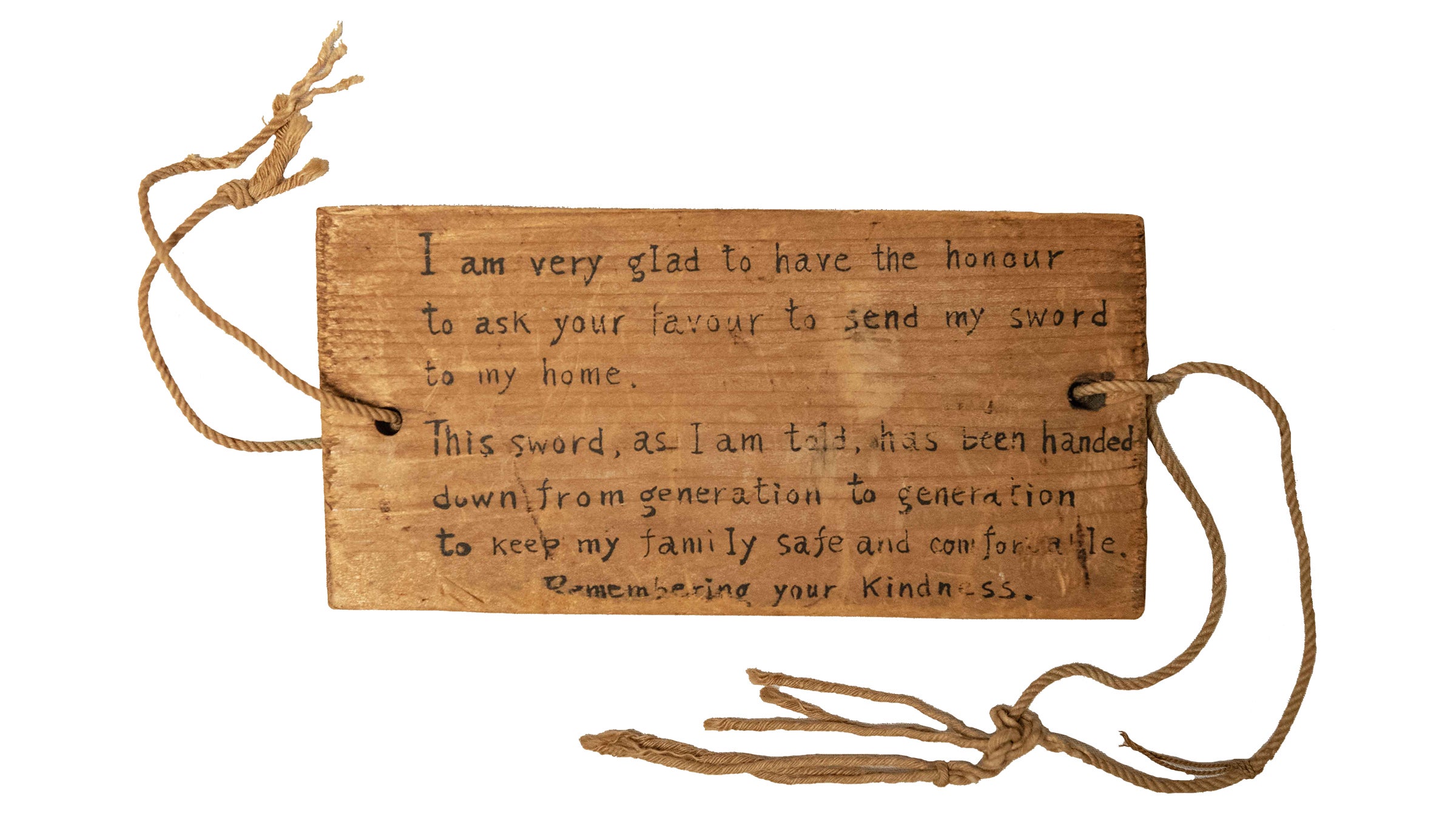 The message attached to the sword was a surrender tag. On one side of the wooden slab, its Japanese owner had inked in perfect British English:
