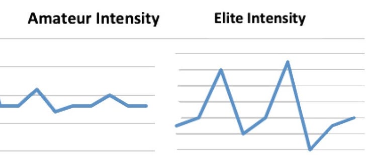 If you graph the pace or intensity of an elite runner’s week, the result will look rather like an elevation chart of Rocky Mountain National Park, with sharp peaks representing very fast and hard days, and deep valleys showing low-intensity, slow ones. In contrast, the same chart of many recreational runners would look like the plains of Oklahoma, nearly a flat line, or maybe the rolling hills of Iowa, with a few slightly-faster hard days and some moderately-slow recovery runs.