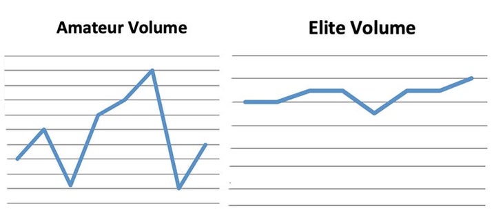 Graph the volume of these groups, however, and the profile is often switched. Elites maintain a relatively high volume week after week, year ’round with a few recovery dips, while amateurs often ramp up from minimal maintenance miles to a peak during a training program, then fall off again until the next urgency. This yo-yoing means they never reach the heights of more consistent runners, they make daily miles harder, and they increase their risk of injury.