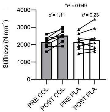 The result was an increase in tendon stiffness. You can think of tendons as elastic bands: the stiffer they are, the harder they are stretch, and the more energy they can store. Stiffer tendons, for example, are associated with better running economy, because they recycle more energy from stride to stride. Here’s the stiffness data, showing how much force it takes to stretch the tendons. In the collagen group, stiffness makes a big jump from before (PRE COL) to after (POST COL) training. In the placebo group, the change in the before (PRE PLA) and after (POST PLA) values is much smaller: