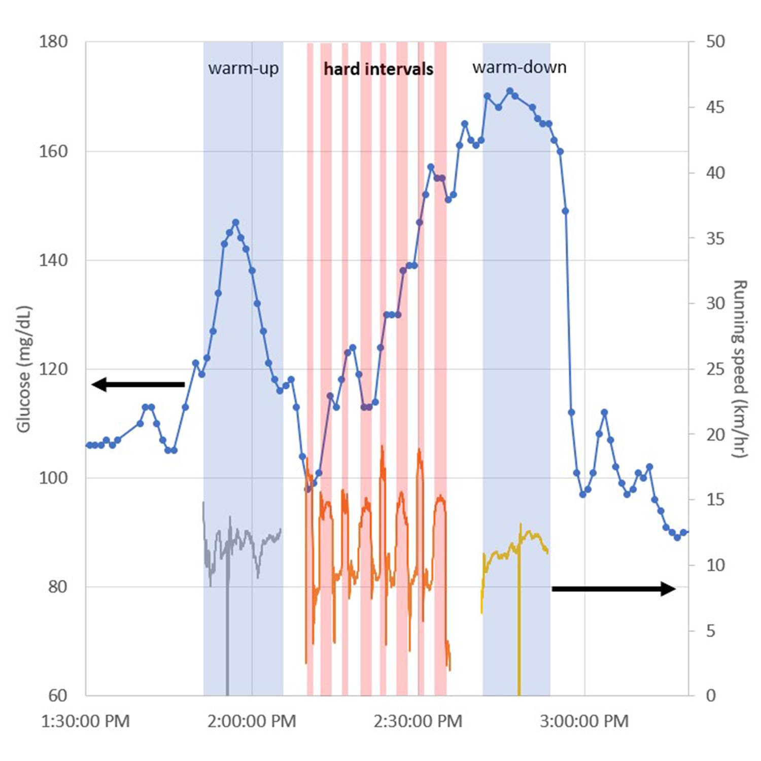 Those readings of 170 at the end of my workout are certainly high, but likely nothing to be worried about, Sprouse says. One good sign: as soon as the workout ends, they drop very rapidly into a more normal range. That likely indicates that my body didn’t need to produce a spike of insulin to bring my blood sugar back down. If I’d taken a gel or other fuel during that workout (which I didn’t), Sprouse would have counseled me not to bother, as my glucose levels were already high enough.