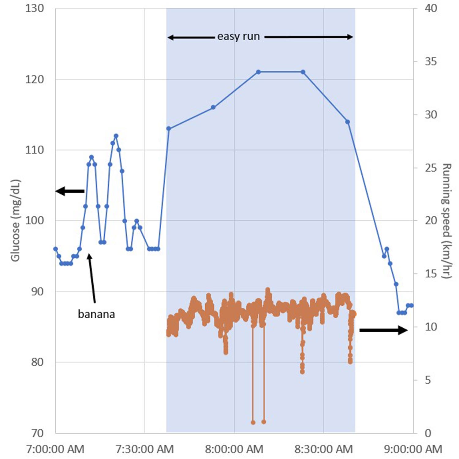 With that caveat, here’s some data, with glucose measurements on the left axis and running speed (measured with a Wahoo GPS watch) on the right axis: