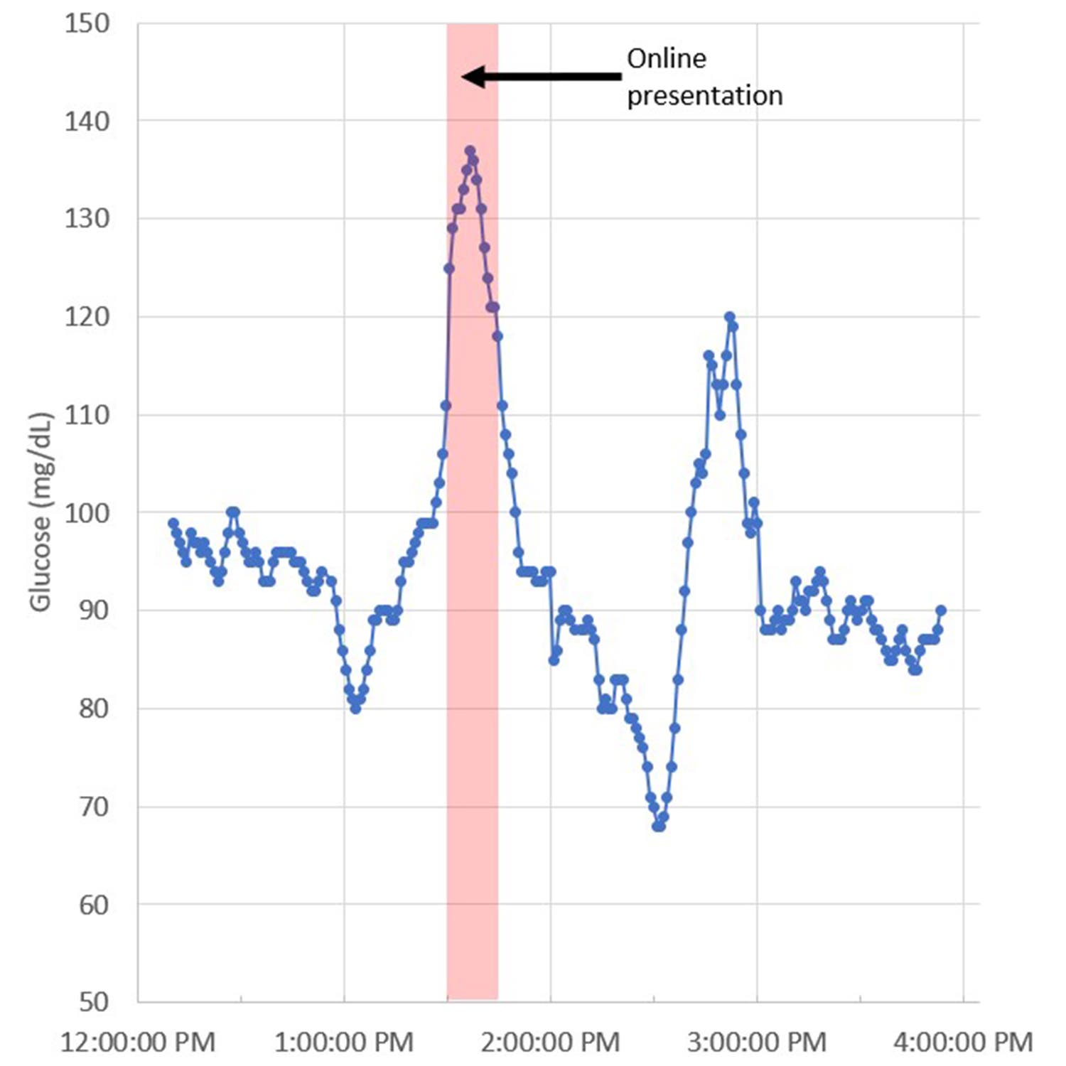 On this particular day, I gave an online presentation to a non-profit group. It was just 15 minutes long, for a small and friendly audience. But hey, I still get nervous. It was fascinating to see how life events, and mental state more generally, affected my blood sugar levels. In the context of exercise, think about the difference between an easy run, a hard workout, and an important race. Your pace is different, but so are your stress levels. In the interval workout above, how much of that staircase effect was feedback (my muscles need more glucose) and how much was feedforward (my brain is on high alert, mobilizing bodily resources in anticipation of demands)?