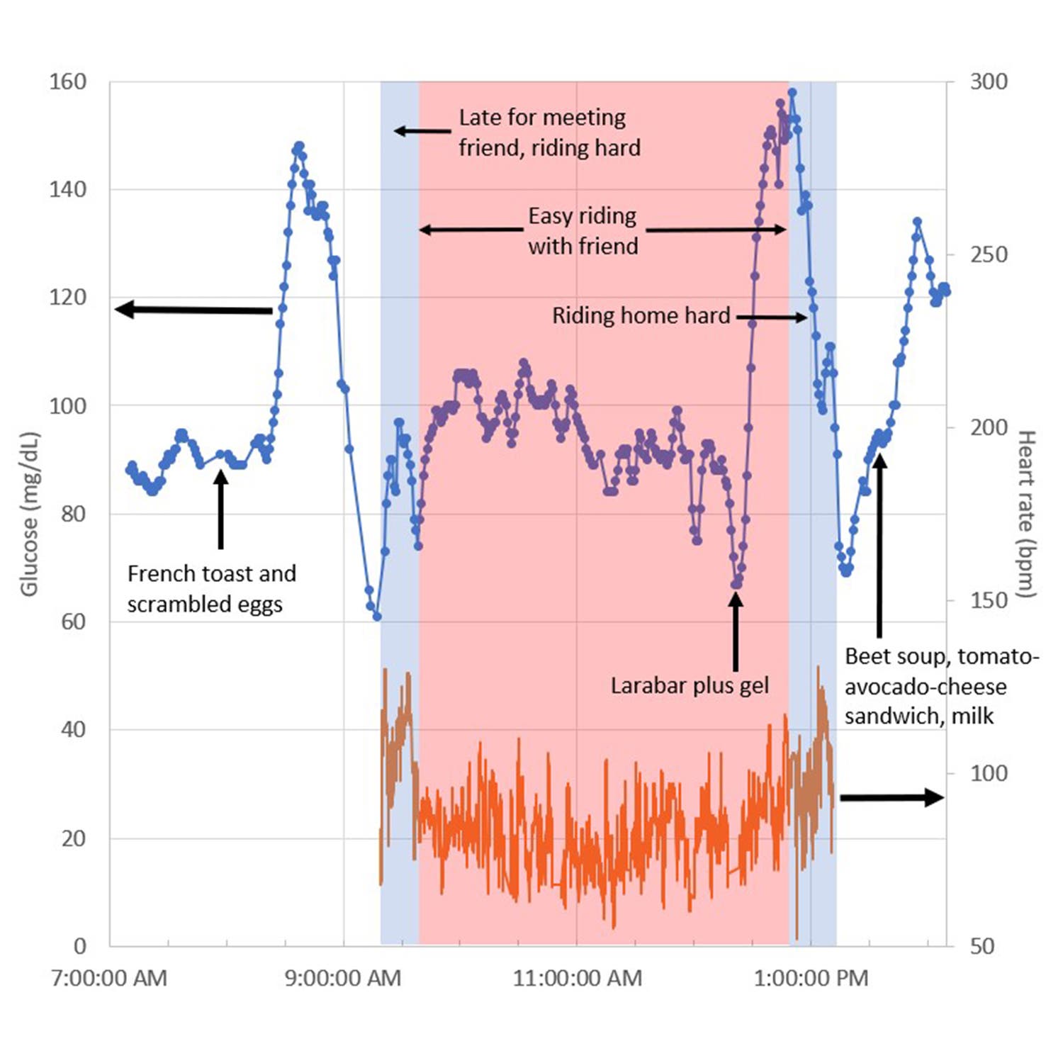 I’m not much of a cyclist, but one of the situations I wanted to test with the CGM was an extended workout where I might conceivably bonk. Would the feeling of hitting the wall actually correspond with an unusually low blood sugar reading? It doesn’t always, Sprouse told me: “We’ve all thought we were bonking and really we just weren’t very fit.”