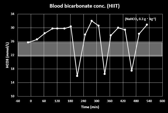 Then he showed them what happened when he exercised. A hard interval workout made bicarbonate levels plunge… but then they surged back up when he stopped. The same thing happened when he did another workout a few hours later. Bicarbonate levels generally stay between about 22 and 26 mmol/L, but the hydrogel dose seemed to be protecting higher levels for many hours. Here’s what his levels looked like when he did three intense interval sessions over the course of five hours, dropping during each workout then rebounding during the recovery:
