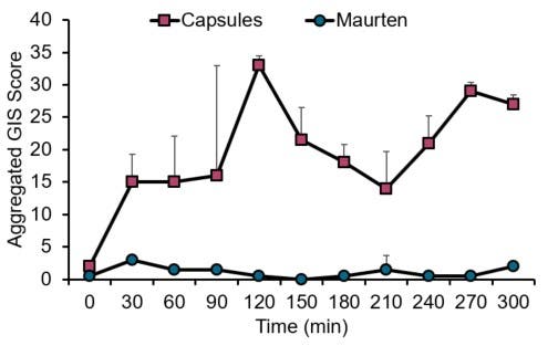The tests are just getting started, but the initial results are “very promising, especially in terms of reducing GI symptoms,” Gough says. At the recent International Sport and Exercise Nutrition conference in Manchester, Sparks presented pilot data from a grand total of two subjects. It’s not exactly publishable, but the visual he presented is certainly eye-catching. The vertical axis here is a total score summing up negative GI symptoms over time (on the horizontal axis) after taking baking soda either as a capsule or in Maurten’s hydrogel:
