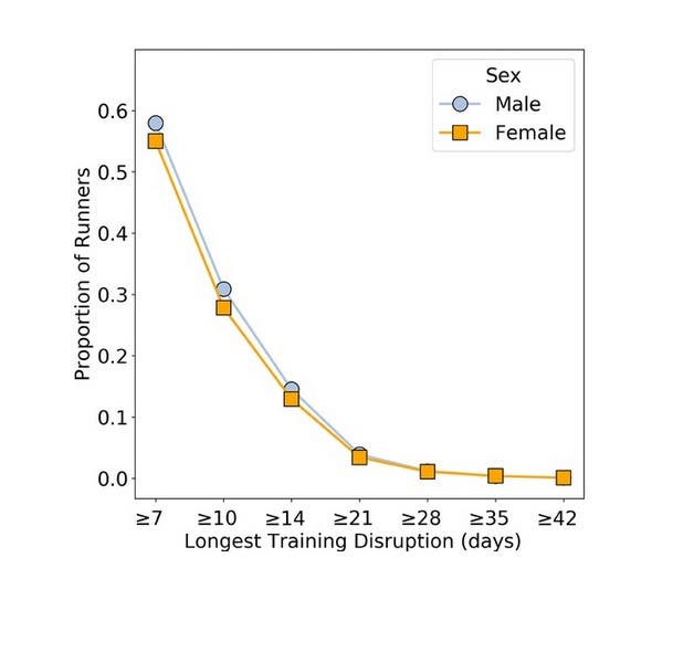 The first thing to note is that training gaps were extremely common among the runners in the study. Among the full dataset of nearly 300,000, more than half had at least one gap of at least seven days during their 12-week marathon build-up, and nearly a third had a ten-day gap. Here’s the proportion of runners (on the vertical axis) as a function of their longest pre-marathon training disruption (on the horizontal axis):