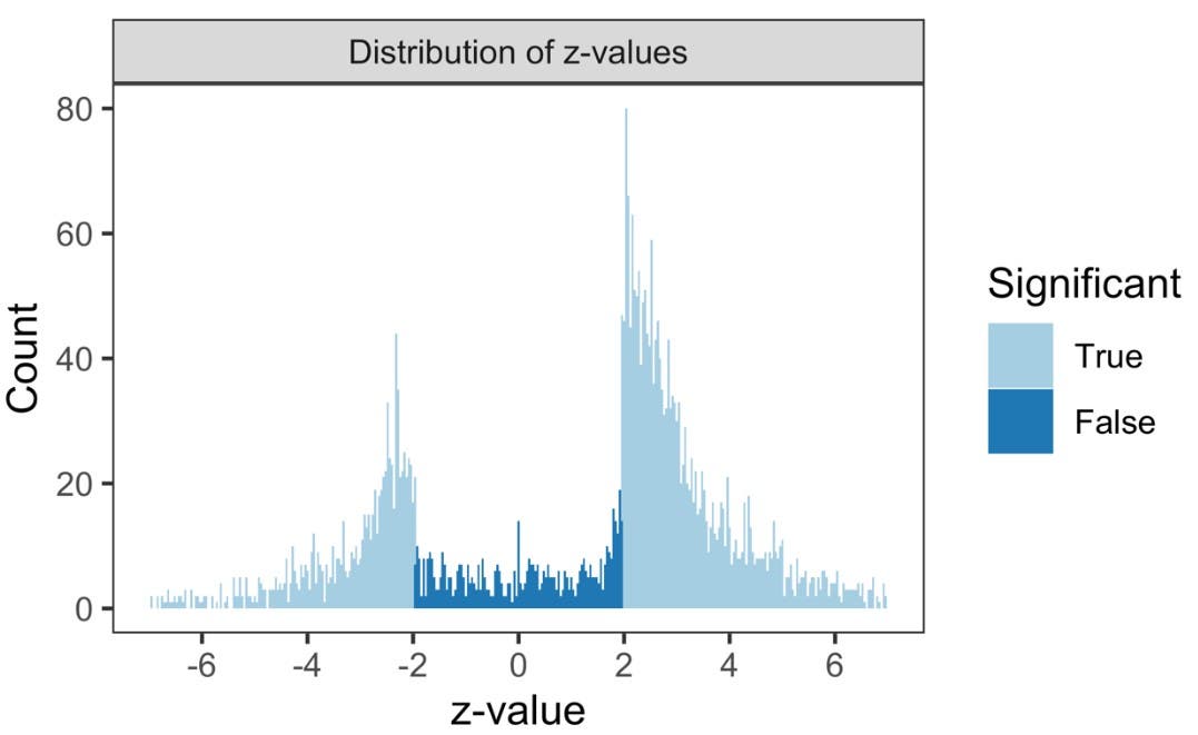 One way to illustrate these results is to plot something called the z-value, which is a statistical measure of the strength of an effect. In theory, if you plot the z-values of thousands of studies, you’d expect to see a perfect bell curve. Most of the results would be clustered around zero, and progressively fewer would have either very strongly positive or very strongly negative effects. Any z-value less than -1.96 or greater than +1.96 corresponds to a statistically significant result with p less than 0.05. A z-value between -1.96 and +1.96 indicates a null result with no statistically significant finding.