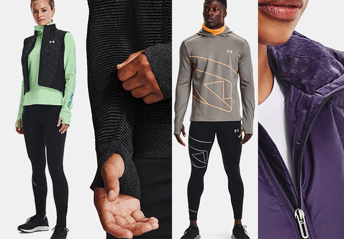 Before you start pulling on your gear, you need to put some thought into your material choices. “The one thing you want to avoid is cotton in cold weather conditions because it retains moisture, dries slowly, and thus can lead to that wet and chilly sensation that causes an uncomfortable experience,” says Under Armour running coach and apparel designer Gabriel Rodriguez. “The goal is to move moisture quickly throughout the fabric and get it evaporated and dried as quickly as possible.” Fortunately, high-performance apparel brands like Under Armour have developed synthetics that dry faster than any natural fiber (like wool), to allow your body to thermoregulate.