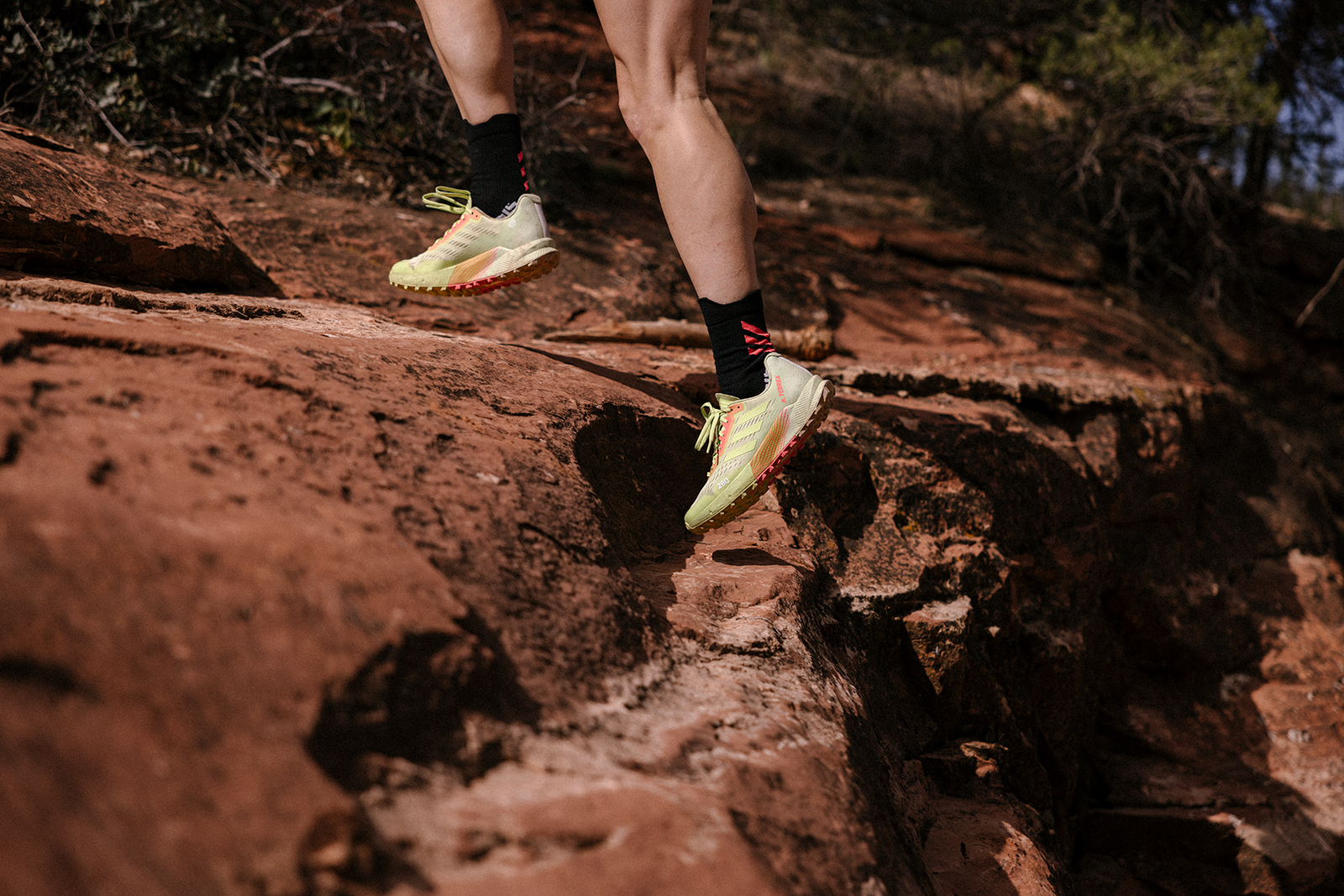 Hall measures her training based on effort and duration rather than pace and distance, a shift that has been instrumental for her growth. “The best way for us to gauge the impact of technicality and grade is just by listening to what our bodies are telling us,” she says. Often, Hall will head out without a set plan of where she’ll run, instead seeking trails or routes she’s naturally drawn to and that offer up a little inspiration. This approach means she could encounter a variety of terrain and she needs a shoe to match, which is why she loves the new adidas TERREX Agravic Flow 2, a do-it-all workhorse. The shoe is light and comfortable, with the easy fit of a road shoe and a sturdy build that offers confidence and protection on technical trails. That versatility makes the Agravic a simple choice for Hall, who might experience dirt roads and rocky singletrack on a single run.