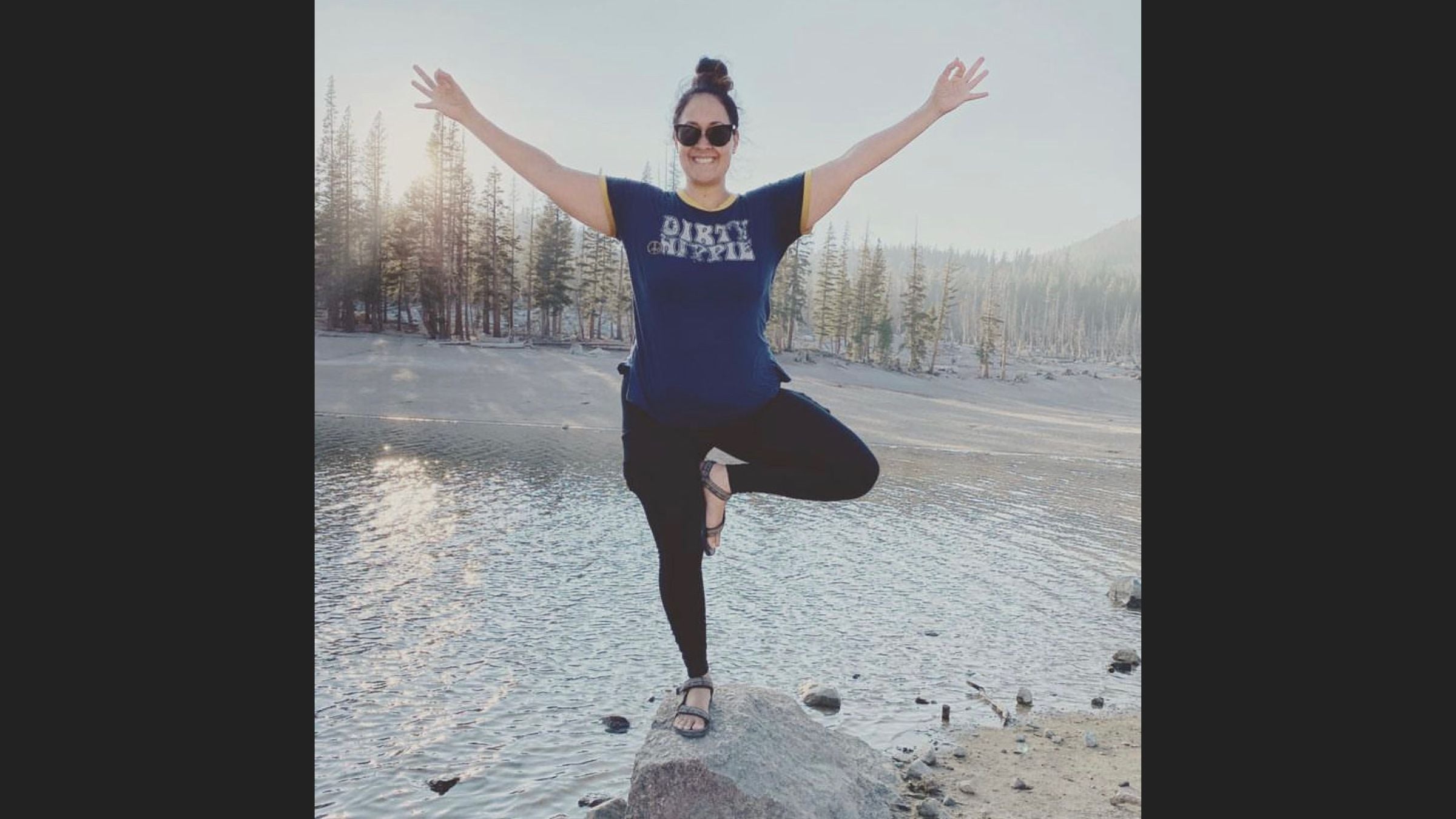 It was peacefully still. You could hear the wind bouncing off of the lake and the light glistening. You could just hear and feel everything around you. I decided that I wanted to do an honoring of her and do a couple sun salutations. Right where she was last out when she was in Mammoth.