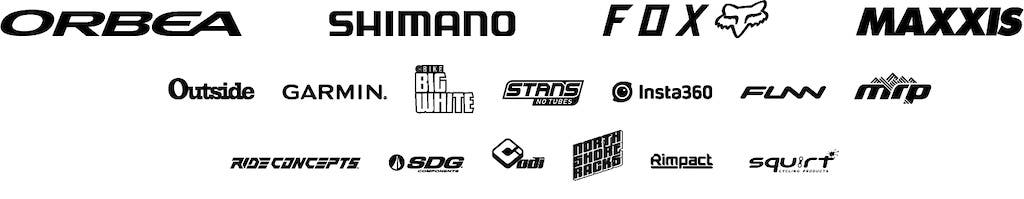Orbea, Shimano, Fox Racing, Maxxis, Outside, Garmin, Big White, Stans, Insta 360, MRP, Funn, Ride Concepts, SDG, North Shore Racks, ODI, Rimpact, and Squirt.