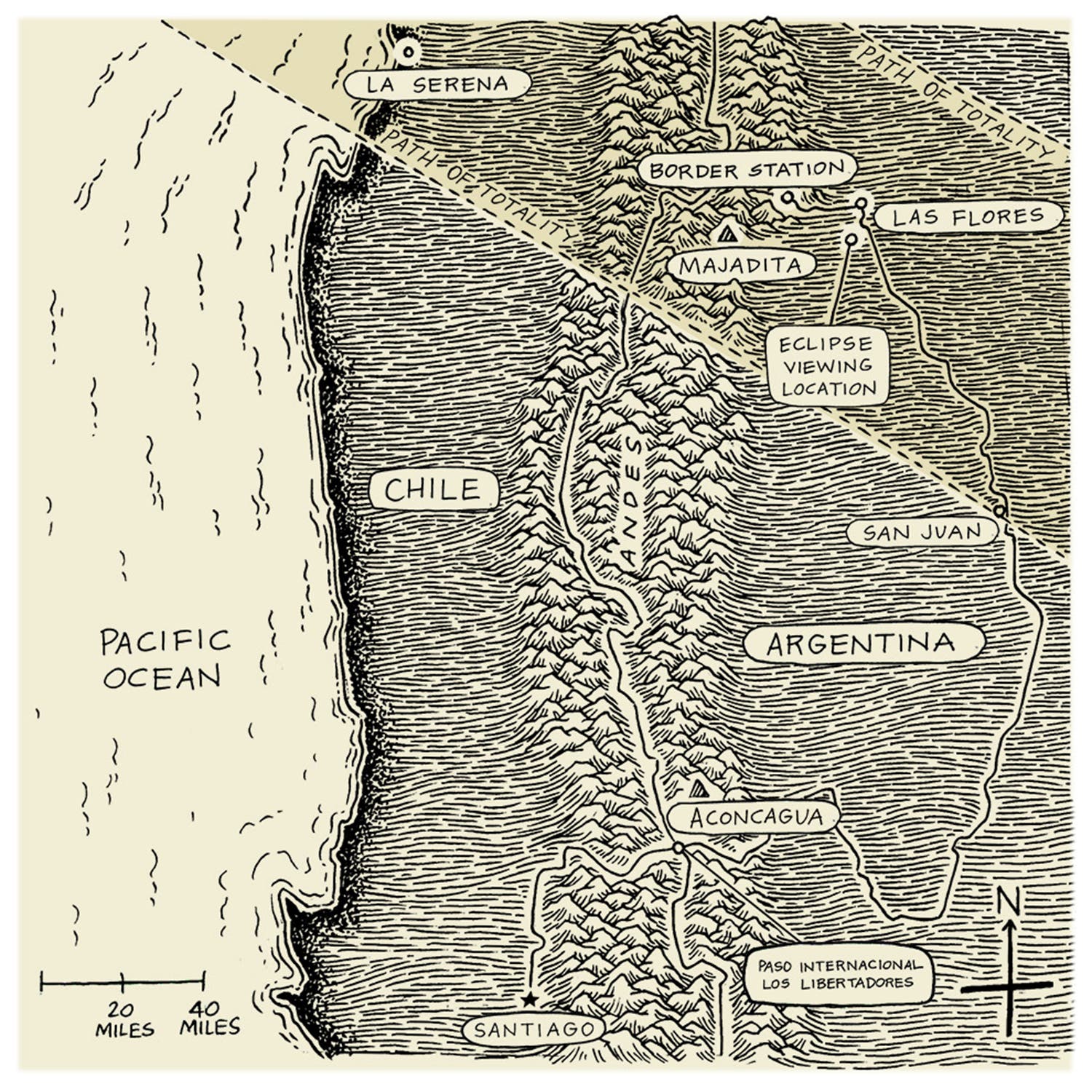 Our international bus trip through the Andes took eight hours. We both had window seats for the ride, which involved dozens of hairpin switchbacks up and over Paso Internacional Los Libertadores, at 12,916 feet. Since it was midwinter, the snow was deep in many places and the mountains dark and foreboding. Large listened to deafening music while I silently questioned the wisdom of our adventure. After sliding through the Tunnel of Christ the Redeemer and dropping into the foothills of Argentina, I returned to my personal journey through the mythology of eclipses.