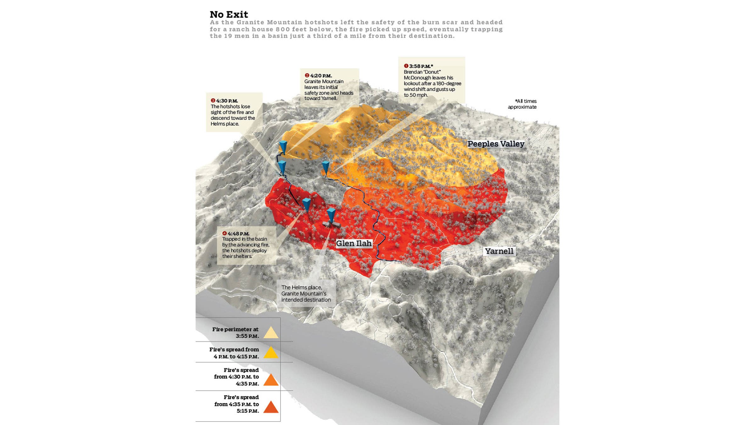 It was a race they couldn’t win. Donut was sitting in the passenger seat of Granite Mountain’s parked buggy, just staring ahead. He’d called his mother and told her that he was OK, but that’s all he could say. The details escaped him.