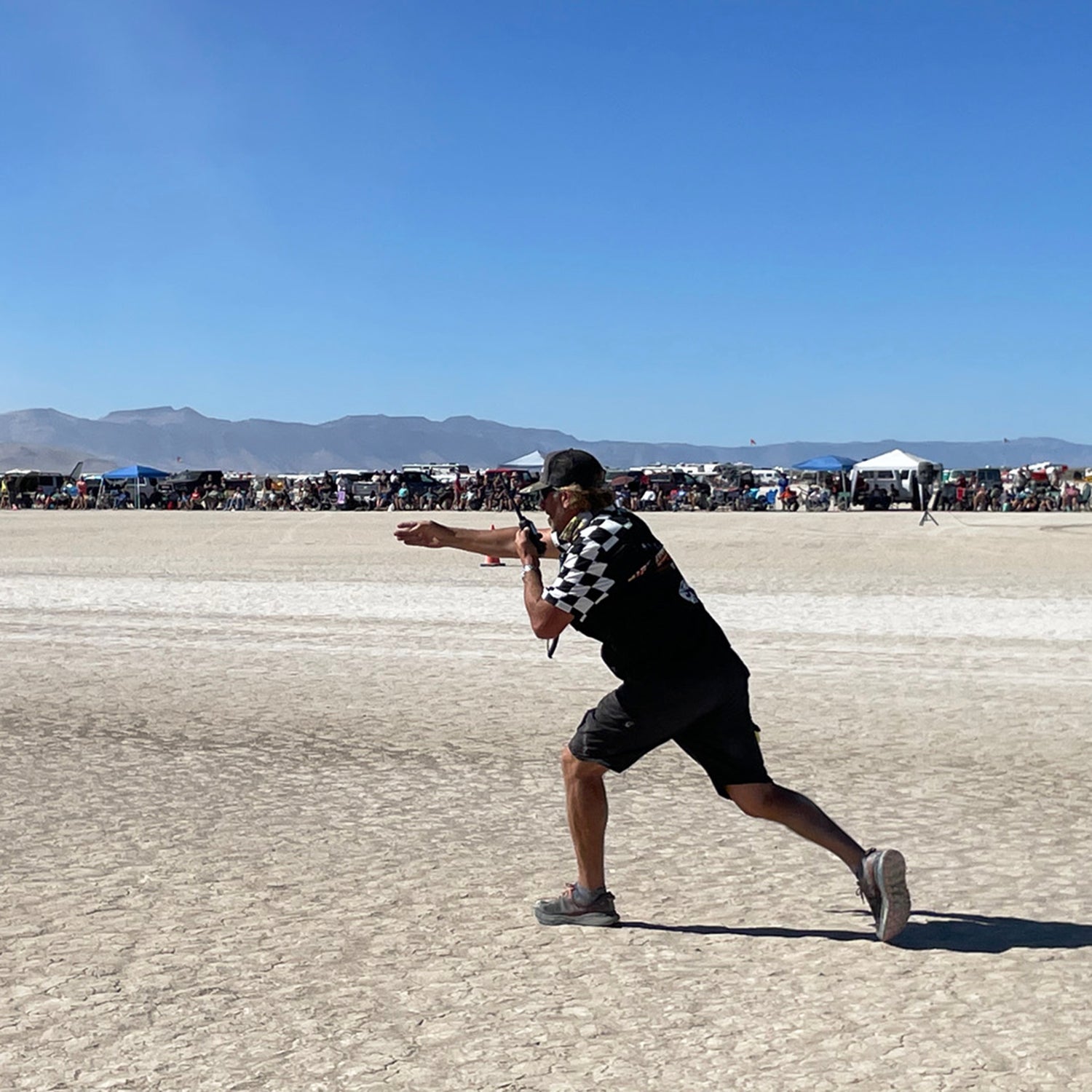 Trent Palmer is here, mentally alert, palate cleansed of the prior evening’s events, his brother and future sister-in-law in shock, without spare clothing, but intact. His mom, Jane, came to the playa after she heard about the toy hauler accident, and now she’s watching her eldest from the gallery. Palmer is here because it’s fun, and damn the plane insurance anyway. The Freedom Fox will race once again.