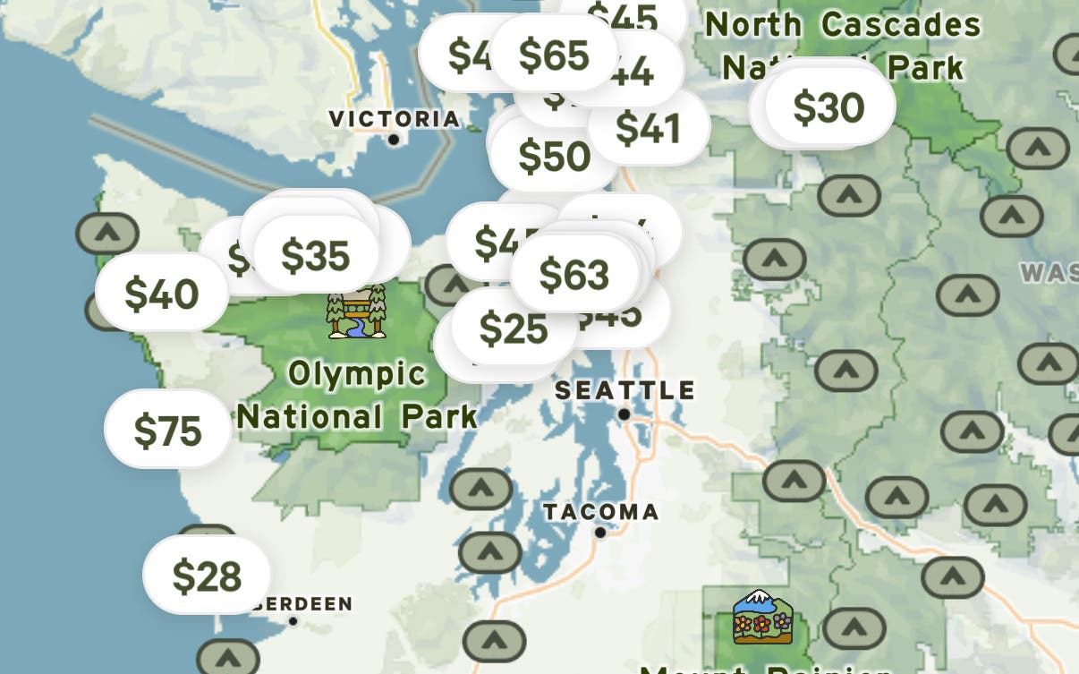 I recently watched Travis Green, the company’s head of product, demo the new app, and it’s very similar to the old model. You plug in your region, dates, and type of campsite (tent, RV, glamping) and then add any amenities (pet-friendly, shower, hot tub, etc) and the Hipcamp app pulls up a scrollable map with various campsites and prices on it.