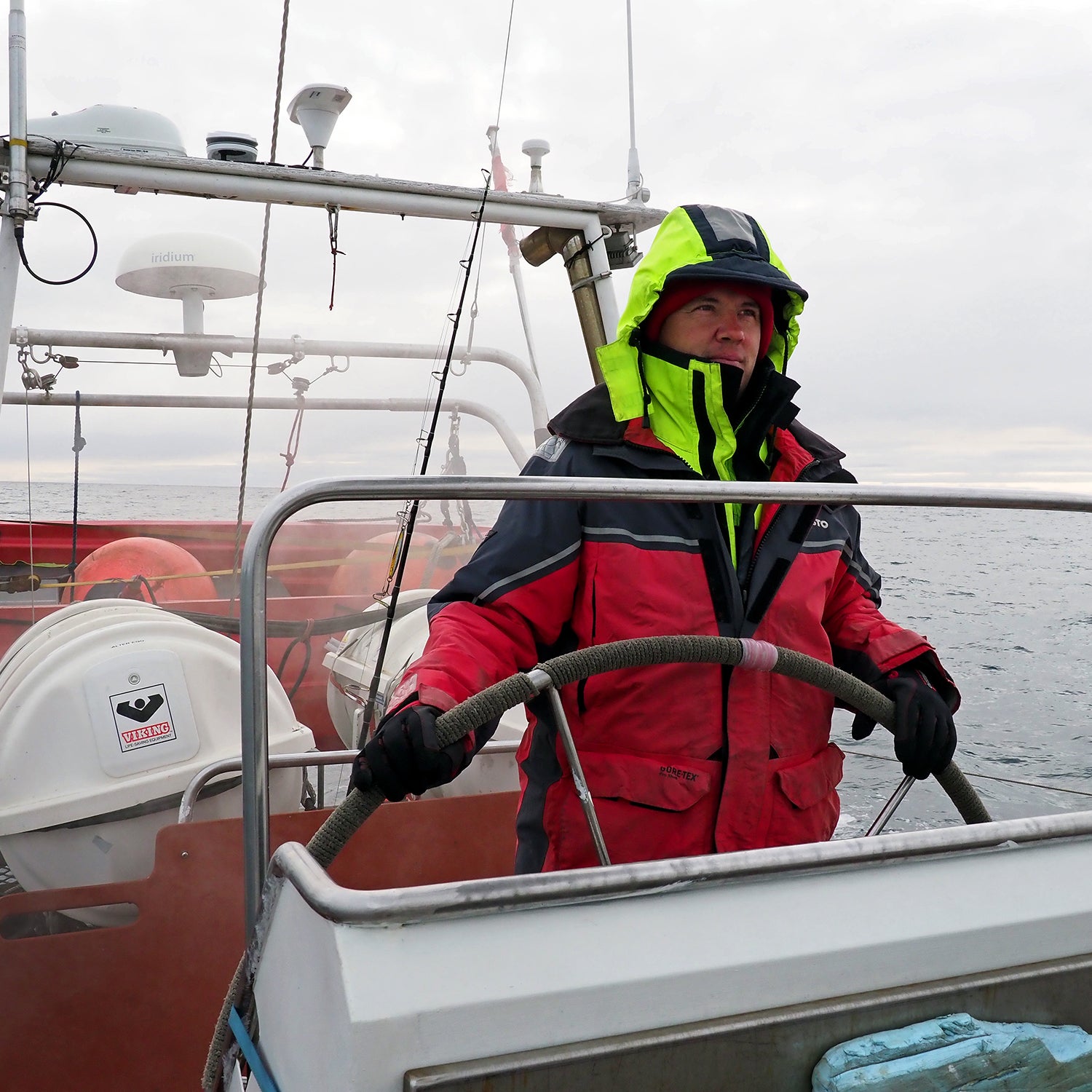 That afternoon, Captain Misha hands me coveralls to wear. We go on deck, where he leans in close to the long boom that nestles perpendicular to the mast. Inside one end is a set of levers.