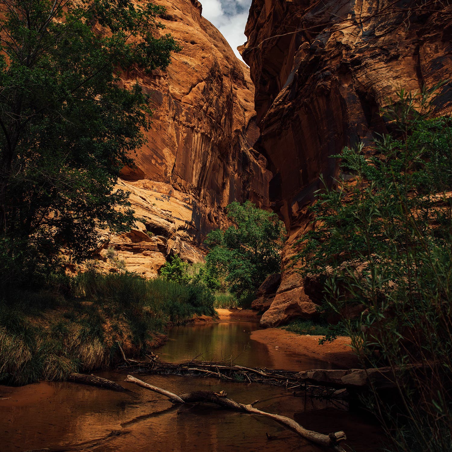 A mile or so down the way, flowing water echoes off the russet canyon walls, pours into a crystal-clear pool, and shimmers in the bright noon sun. In one swoop, Caroline slips off her clothes and jumps in. She reappears farther down the creek. I follow suit.