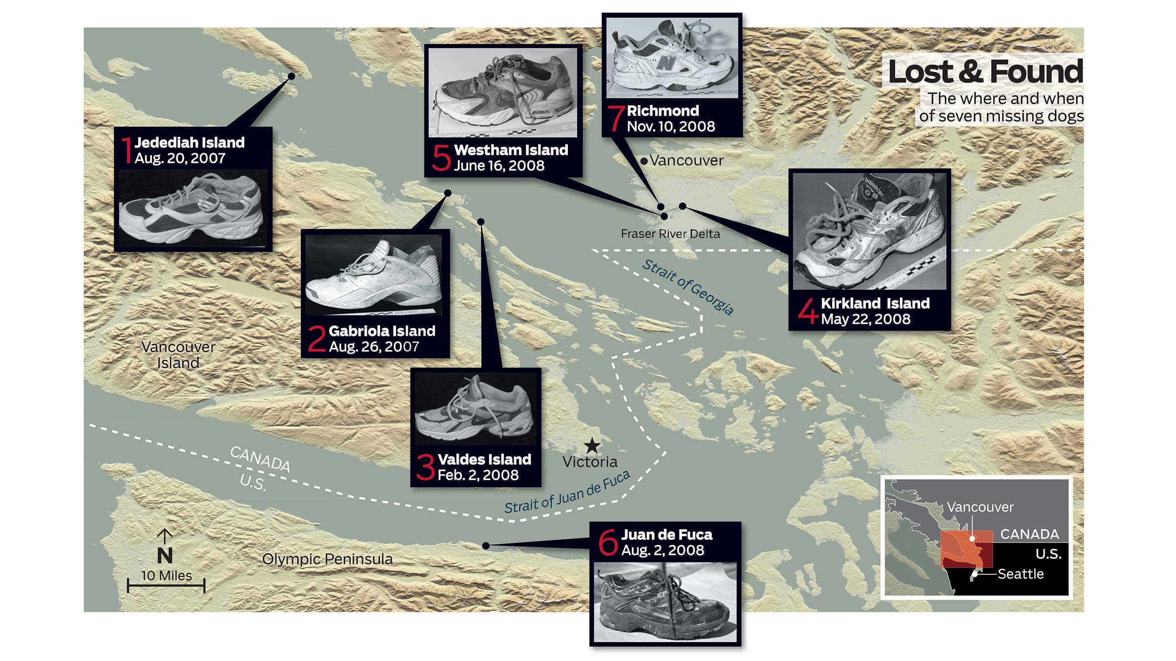 And, right then, out plops the Start of Everything. Because inside the sock is a human foot. Over the next 15 months, six more feet, also clad in socks and sneakers, will wash ashore at six different places on the puzzle of islands in the Georgia Strait, between Vancouver and Vancouver Island, and in the nearby Fraser River delta.