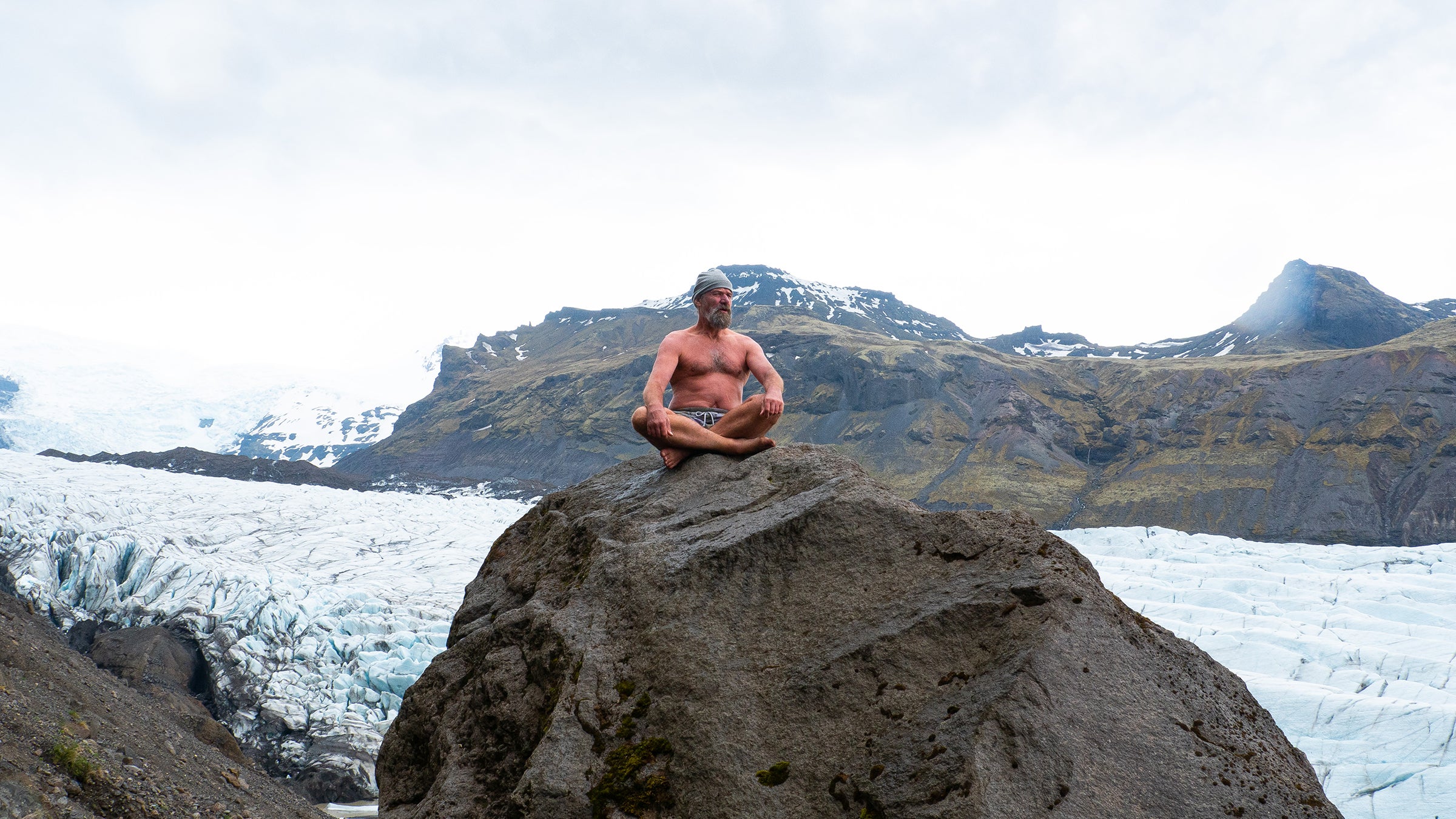 In the afternoon, we hit as many icy locations as possible while the crew films Hof doing Hof-like things. There’s no shortage of dramatic options: icebergs, ice fields, ice boulders, ice caves, icy lakes, icy streams, more ice-filled lagoons. “We can pick anything here?” Hof asks gleefully. “Shit! It’s like the candy store!” He meditates in the lotus position on a slab of ice, generating so much body heat that when he gets up there’s a melted depression where he was sitting.