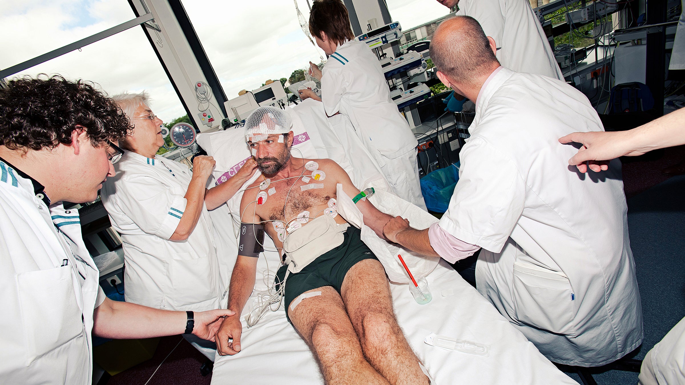 “That’s where it all began,” Hof says now, looking sober. Crumpling with grief wasn’t an option; now he was a single parent to the couple’s four children, two girls and two boys, all under the age of 12. Hof kept breathing, kept freezing. “I fell into the valley and got myself back,” he says. People began to take notice of the guy who was always sitting around in the ice. Soon, Hof was performing his icy stunts on TV, claiming to be able to regulate not just his body temperature but other autonomic functions as well. “And then science came in,” he recalls. “They invited me to be tested.”