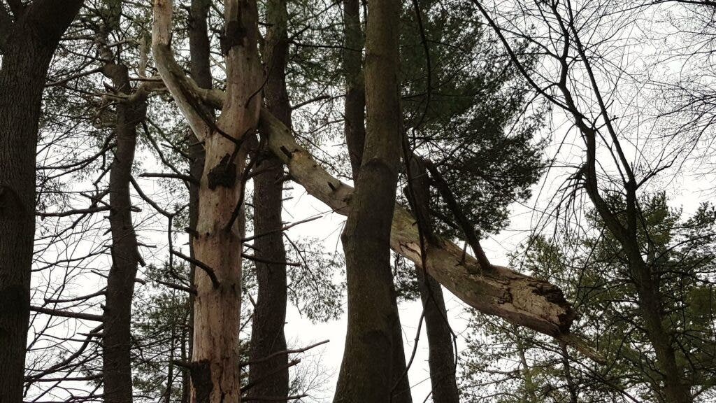 There are two things to look for first: hung snags and widow-makers. Hung snags are dead trees that have begun to fall but are caught in the branches and trunks of adjacent trees and haven’t hit the ground. Even if they look stable, they could easily shift, break apart, or even uproot the tree they’re leaning on.