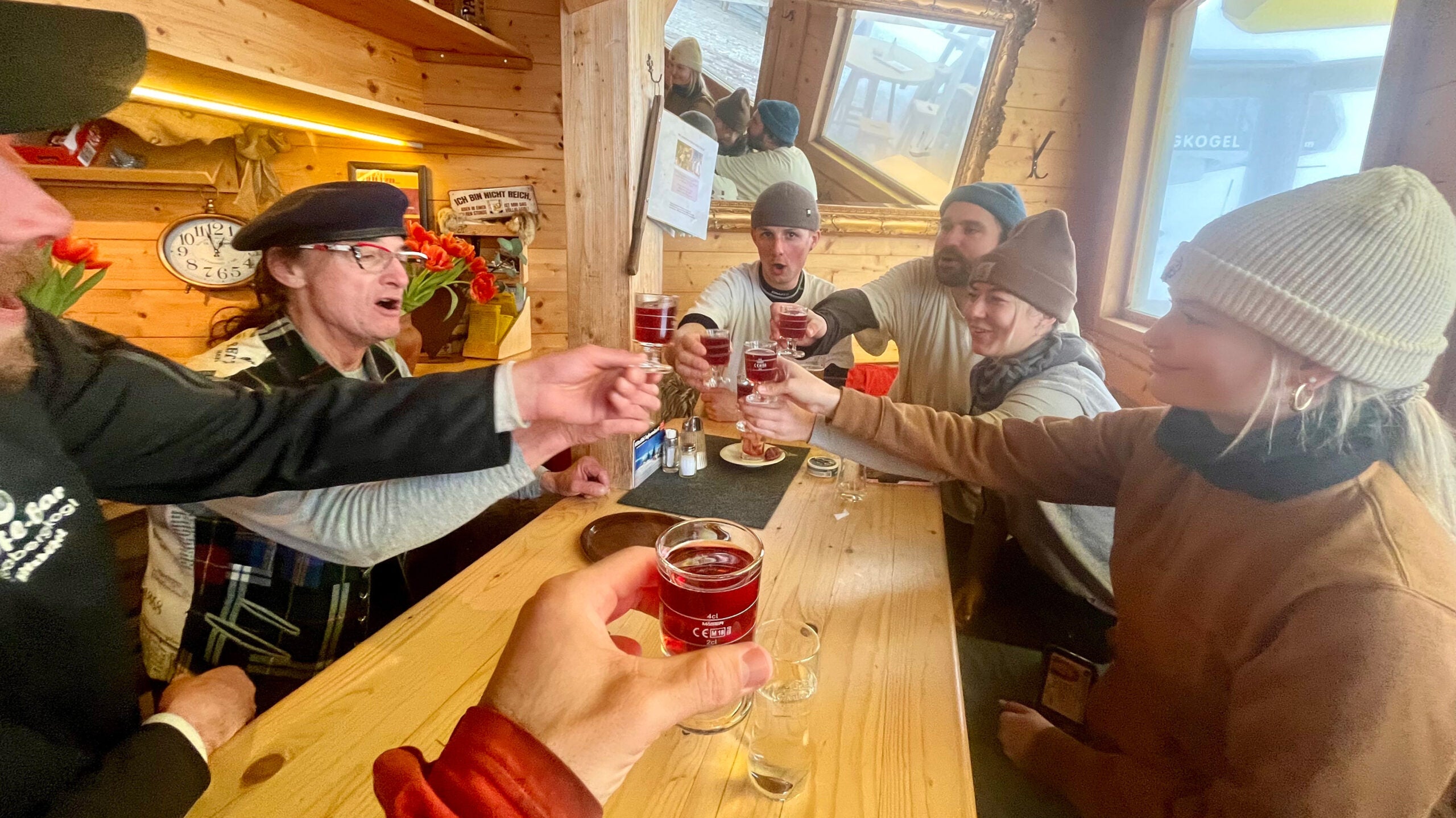 The place, built by a kilt- and beret-wearing Austrian named Stevé who had lived in Kitzbühel “since nineteen hundred and eighty-two,” was no bigger than a kitchen and was packed with revelers. Cas, a warm-spirited Dutch bartender, asked if I wanted a Super Shoki, which his buddy Max was sipping: hot chocolate with rum, salted caramel Bailey’s, and whipped cream. The bar was cash-only, and I didn’t have any notes. “It’s OK,” Cas said, already making my drink. “You can come back and pay tomorrow.”
