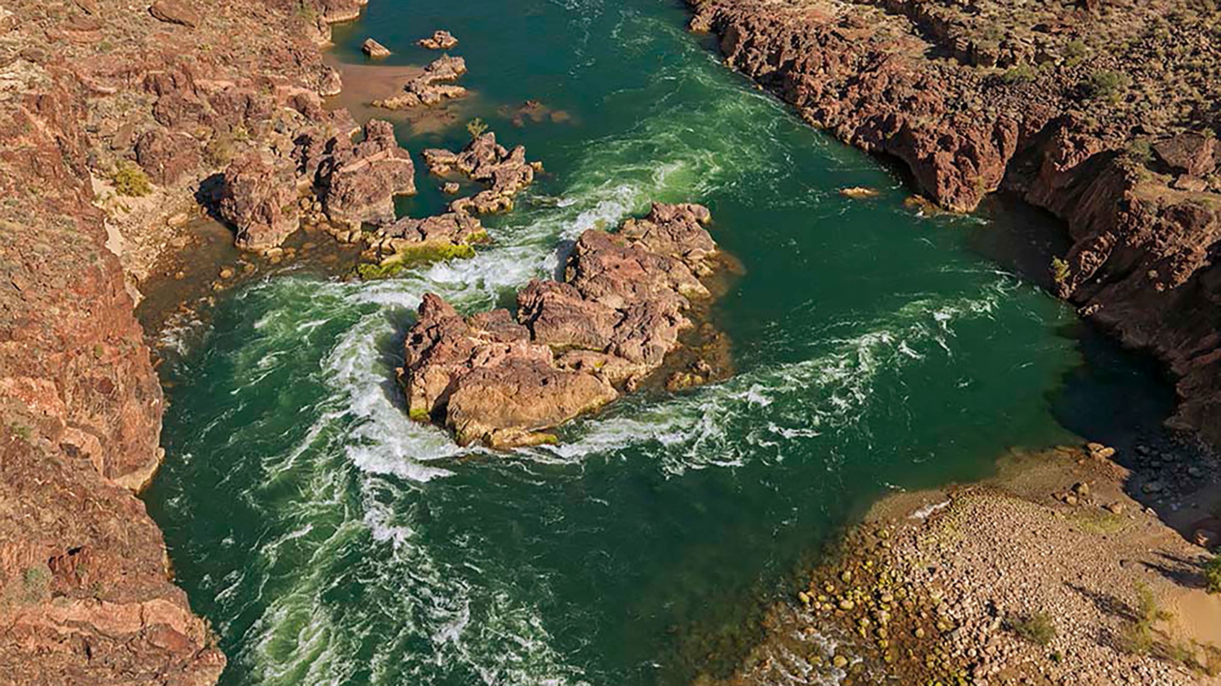 Around 1:30 P.M. the party approached the top of Bedrock rapid, a perilous stretch of whitewater where the river is divided by a hulking island of Vishnu schist, the Earth’s oldest exposed rock. Grand Canyon guides call it “Dreadrock” because of the prevalence of accidents there.