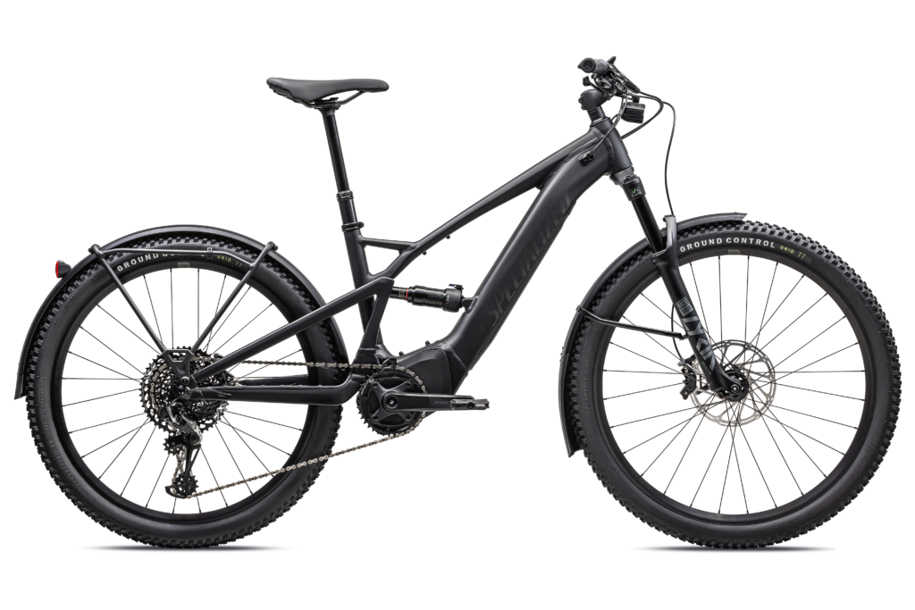 With 120 millimeters of rear travel and a 130 millimeter fork that utilizes a single-pivot suspension layout, the bike has enough travel for actual off-road riding—this is not just a warmed-over commuter bike. That doesn’t mean it wouldn’t make a great commuter, though, especially since all models have fenders, a rear rack, plus integrated headlights and tail lights. The highest end model has a 1,000 lumen front light, and a tail light that gets brighter when the brakes are applied.