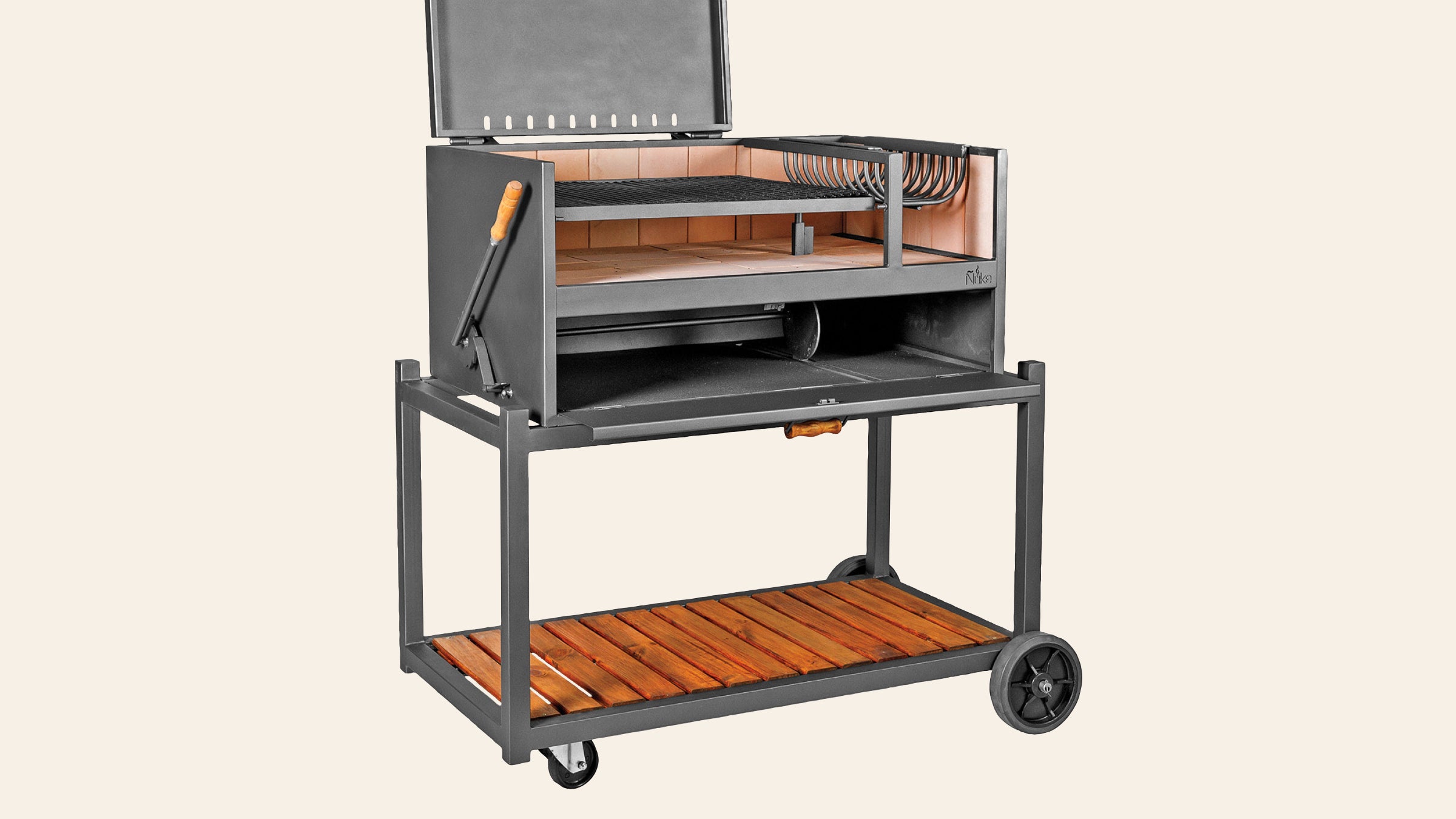 The Ñuke Delta is inspired by the gaucho grills of Argentina, where cooking over fire is considered an art. The grill itself is handmade there, too. Ignite hardwood or charcoal in the suspended metal basket and use the included shovel and poker to arrange the coals as they fall through the bottom. Then get cooking on the massive 26-by-21- inch grate, raising or lowering it as needed. Bricks line the whole cooking area, efficiently radiating heat upward. There’s a hood for covered cooking, a grill plate for pan-like searing, and a warming drawer to keep your food toasty.
