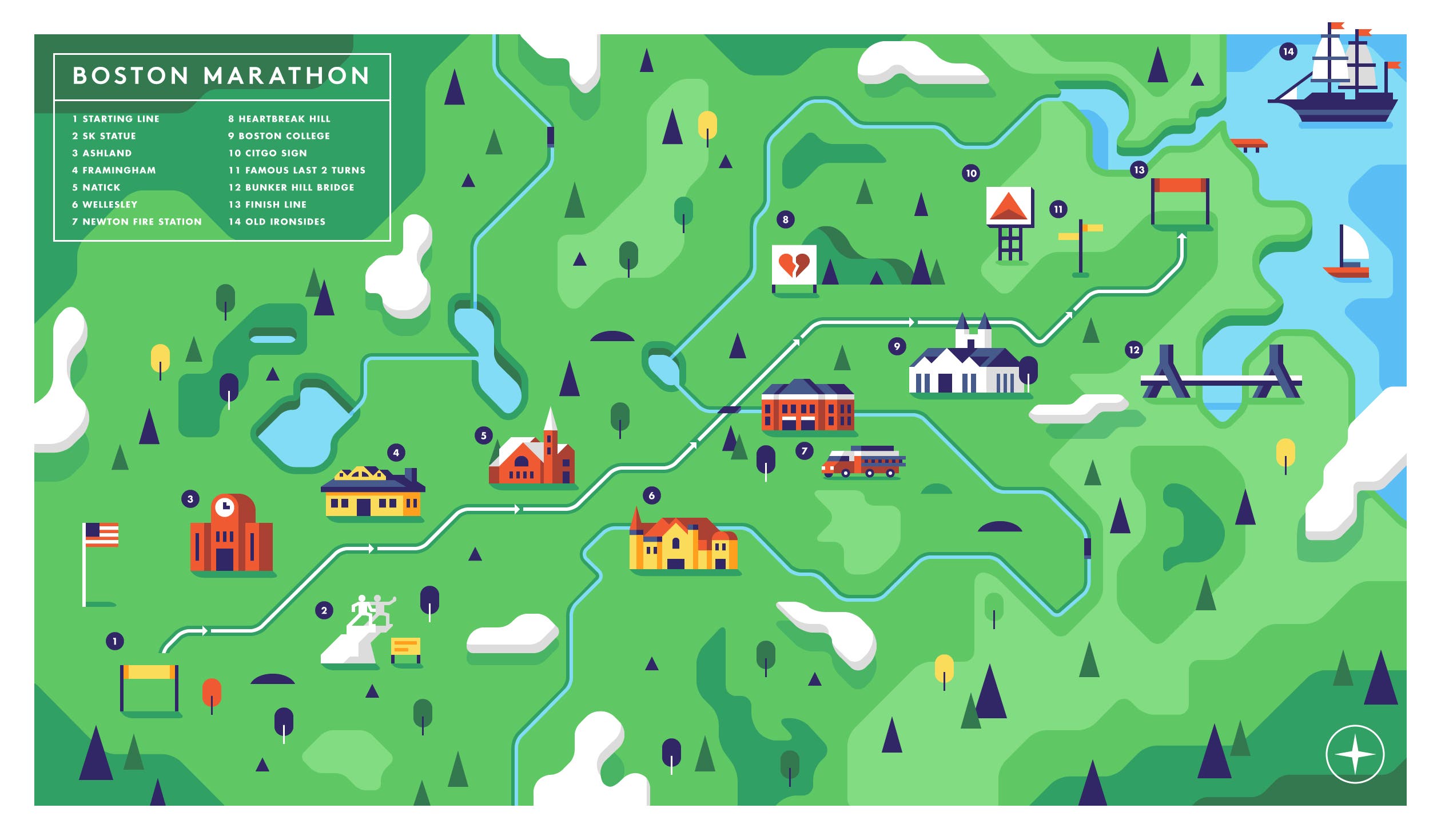 Course: A point-to-point road race with a net downhill from Hopkinton to downtown Boston. After the trial of the four Newton Hills, the last of which is ominously named Heartbreak Hill, runners push for another five miles until hearing those magical words referencing the final two turns of the race: “Right on Hereford. Left on Boylston.”